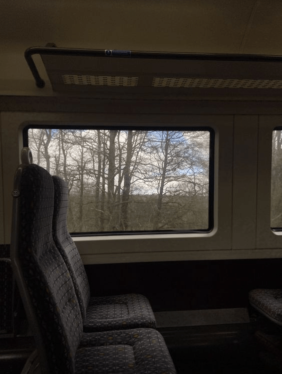 The guitar is soft but steady, it’s going to be alright, a pat on the back from Lennon. This time, you don’t believe him. The drink cart usually sails by, ignored, or given a gentle wave of no by each row. But not today. Something is keeping the train bar cart longer than usual. You look out the window again, hoping the changing leaves will be distraction enough.
