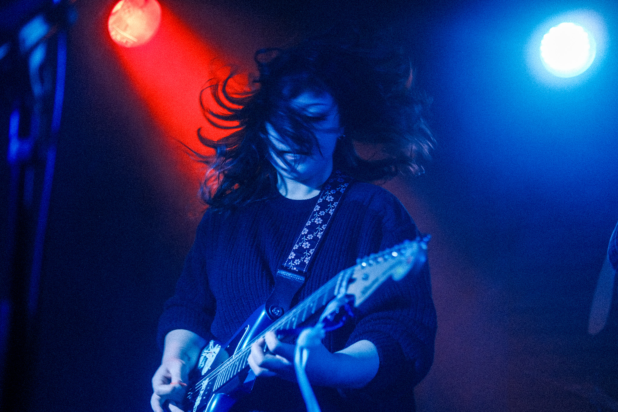 Toronto’s very own Monstrosa opened the show with a set that left me in a cold sweat. I mean, how do you begin to describe a performance that features multicolor graduation caps, crocheted luchador masks, a burlesque show, and a drummer in ambiguous reptilian headgear? You say, “Woah, this is fucking sick.” Monstrosa doesn’t pull any punches, which is ironic given their on-stage allusions to pro wrestling. Clad in silver pants and fishnet stockings, Monstrosa is L7 meets Morticia Addams. They couple melodic, winding vocals with grungy riffs that leave you unsure whether to headbang or break into song. Their 2023 album, Mild Fantasy Violence, straddles genres by incorporating heavy metal drums on tracks like “I Like Girls Like You,” only to pivot to a math rock rhythm on “Make My Move.”